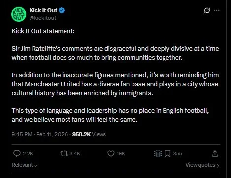 Anti-discrimination and anti-racism groups moved quickly. Kick It Out described the comments as “disgraceful and deeply divisive.”