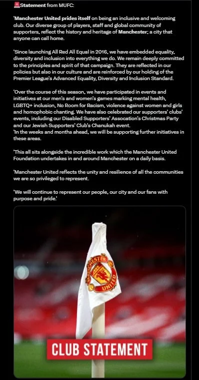 There is also a competitive context with United positioned as a modern club with an ‘All Red All Equal’ identity. United’s business model depends on inclusion being uncomplicated and unquestioned.