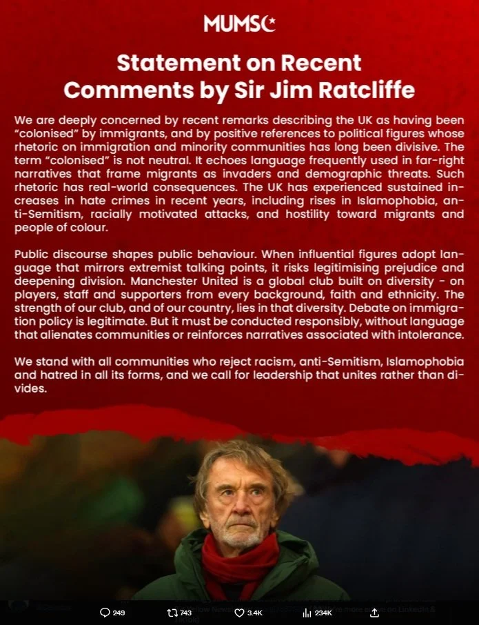 Sir Jim Ratcliffe’s comments that the UK has been “colonised by immigrants” have sparked a backlash that has quickly spilled into football, forcing Manchester United into damage-limitation mode and raising fresh questions about the club’s communications discipline under its new leadership.